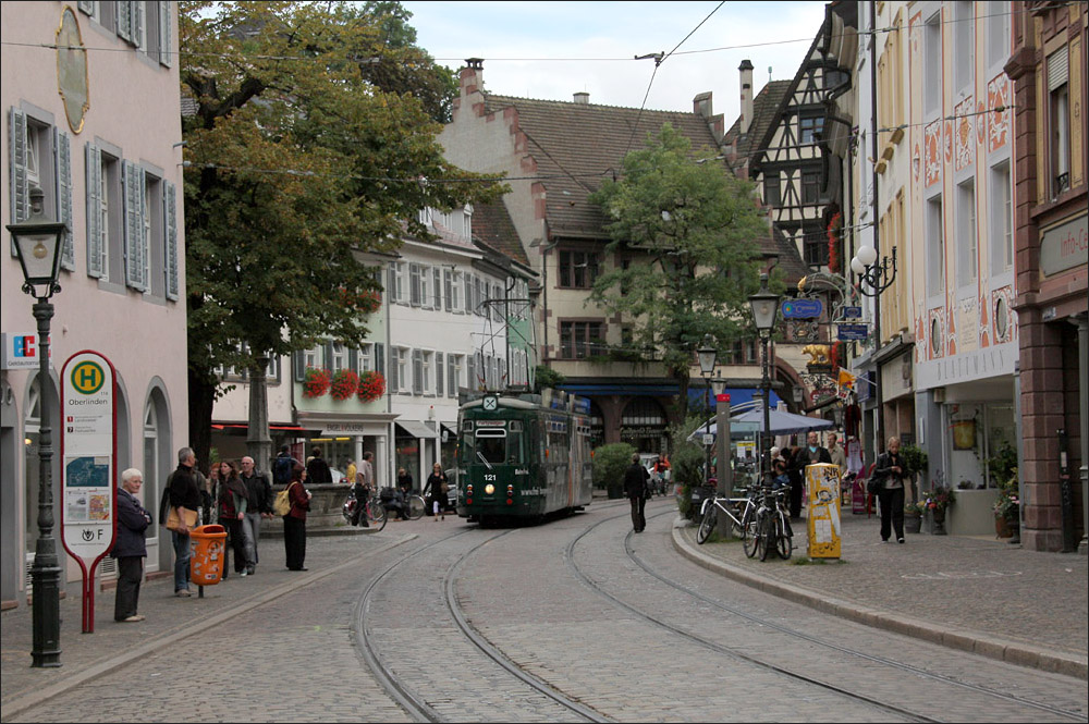 . Ein GT8Z-Straßenbahn wird gleich die Brückenrampe zur Haltestelle "Hauptbahnhof" erklimmen. Diese Straßenbahn ist eine Spezialkonstruktion von Duewag für Freiburg. 18.09.2010 (Matthias) GMJ Frey